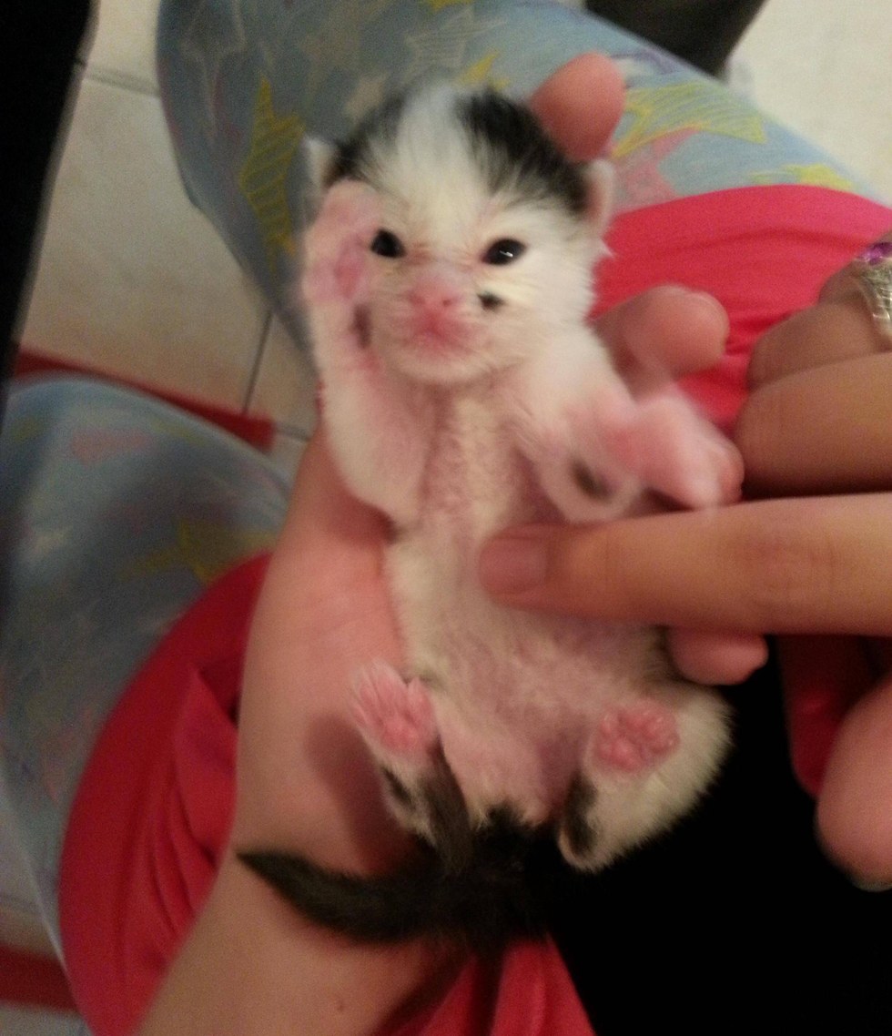 Mini minicik bir kedi, bir binanın arkasında, bir odun parçasının altına sıkışmıştı. Her yanı kurtçuklarla kaplanmıştı, ölmek üzereydi. Köpek Opie, bu zavallı yavruyu orada bırakmak istemedi ve onu eve götürdüler.