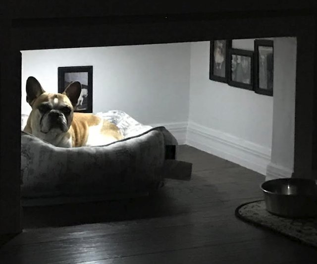David, ilk başta öyle gözükmese de köpeği için en mükemmel alanı yaratıyor. Yeni evin merdivenlerinin altında kendine ait bir odası da böyle oluyor Hennessy’in…